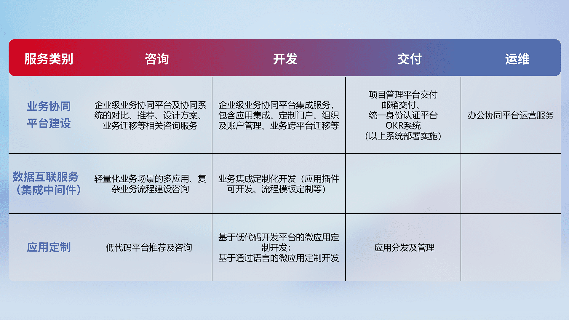 针对钉钉、、企微、、、IDaas等平台级产品提供产品的规划、、方案、、交付、、定制化开发等服务,,,,实现如统一协同办公、、、、智能客户服务、、、混合会议管理、、、、智能数据查询、、、、等业务场景,,,,实现数字化转型。。。。