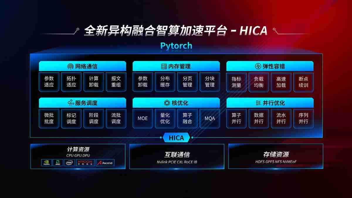 通过自研的服务层、、、中间适配层、、、、以及调度编排算法,,,采用数据并行、、、、模型并行等多种并行方式,,,,把并行计算任务进行有效的分解,,使其分别由相应的软件栈和算力资源来承接。。。当GPU资源变化,,HICA可以实时动态调度计算子任务并调整模型拓扑和架构,,,,以充分聚合各种算力资源。。。