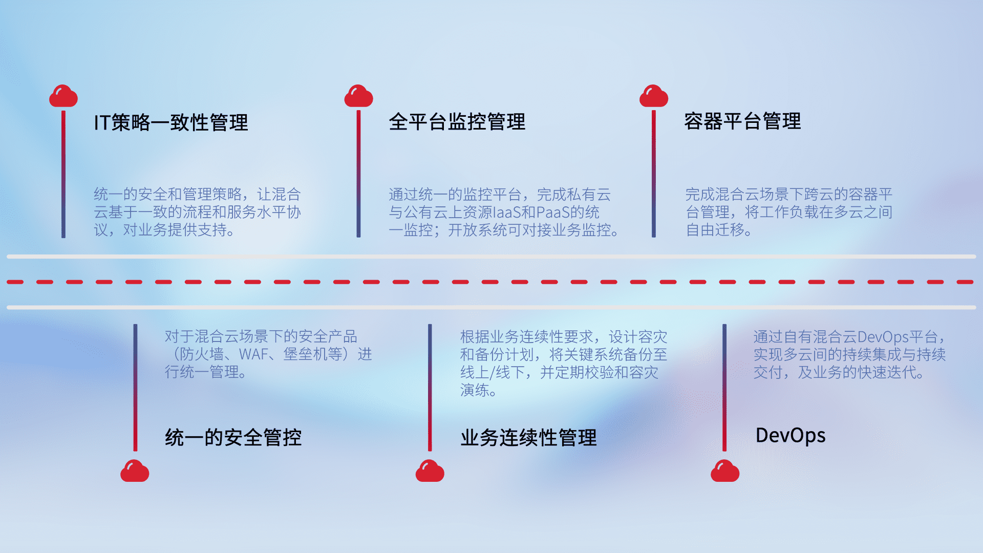 通过多云纳管,,,以统一的资源数据模型把客户的云资源进行抽象和封装,,进而实现对多云资源的统一操作,,保障云资源管理的可靠性、、稳定性与可用性。。。量身定制化运维内容,,,,配置、、、开发运维、、、、补丁管理、、、、备份、、、监控、、认证和访问管理、、审计和日常巡检等,,保障在用云过程中的可靠度,,,,稳定度以及高可用率。。