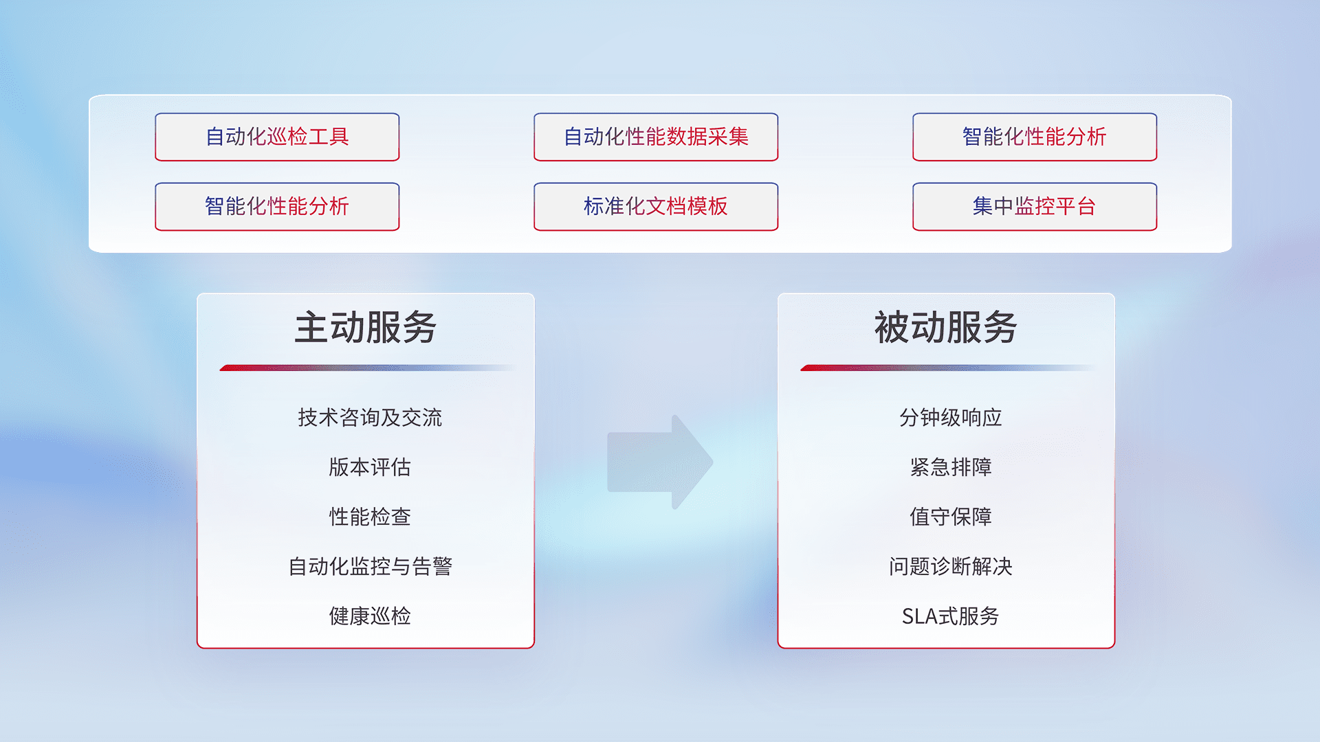 智能化工具和标准化文档,,,,保障服务质量,,,提供主动服务(包含技术咨询、、、版本评估、、、、性能检查、、自动化监控与告警、、、、健康巡检)和被动服务包含(分钟级响应、、、、紧急排障、、、值守保障、、问题诊断解决、、SLA服务)。。。。