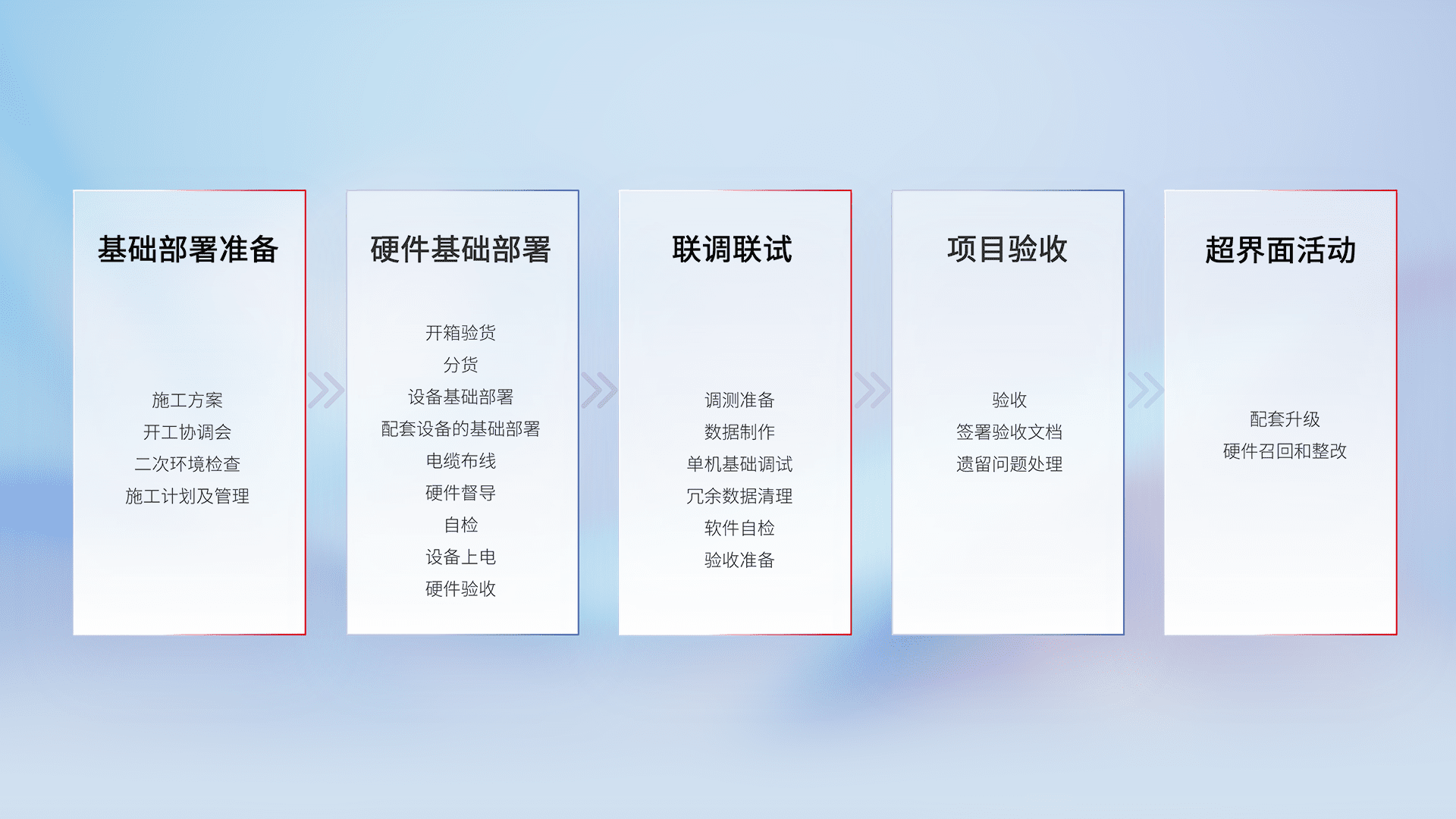 从基础部署准备、、、硬件基础部署、、、、联调联试、、项目验收、、越界面活动的全过程可追溯,,保证施工质量和进度。。。